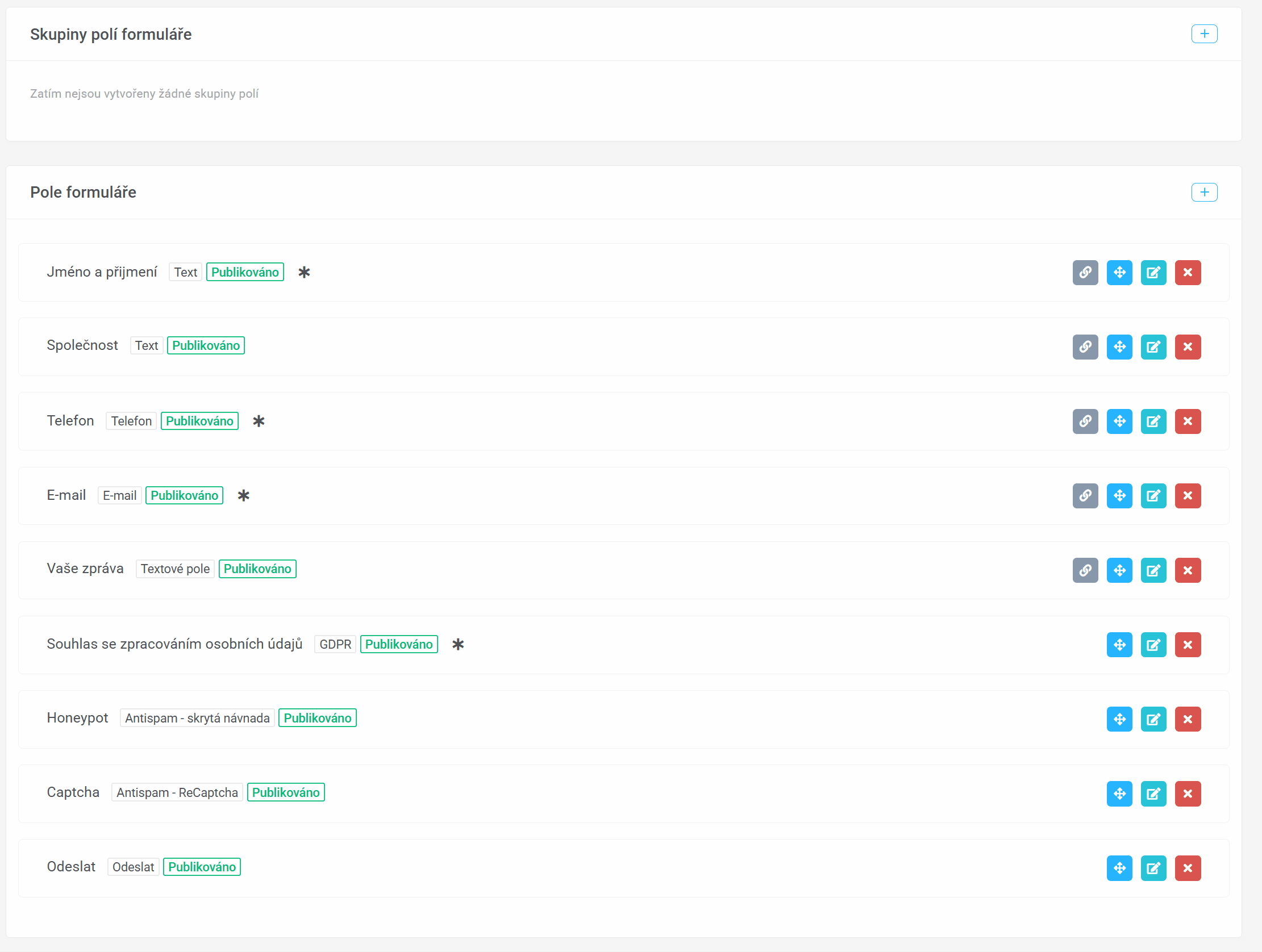 - přednastavená pole: Souhlas se zpracováním osobních údajů, Antispam a Odeslat