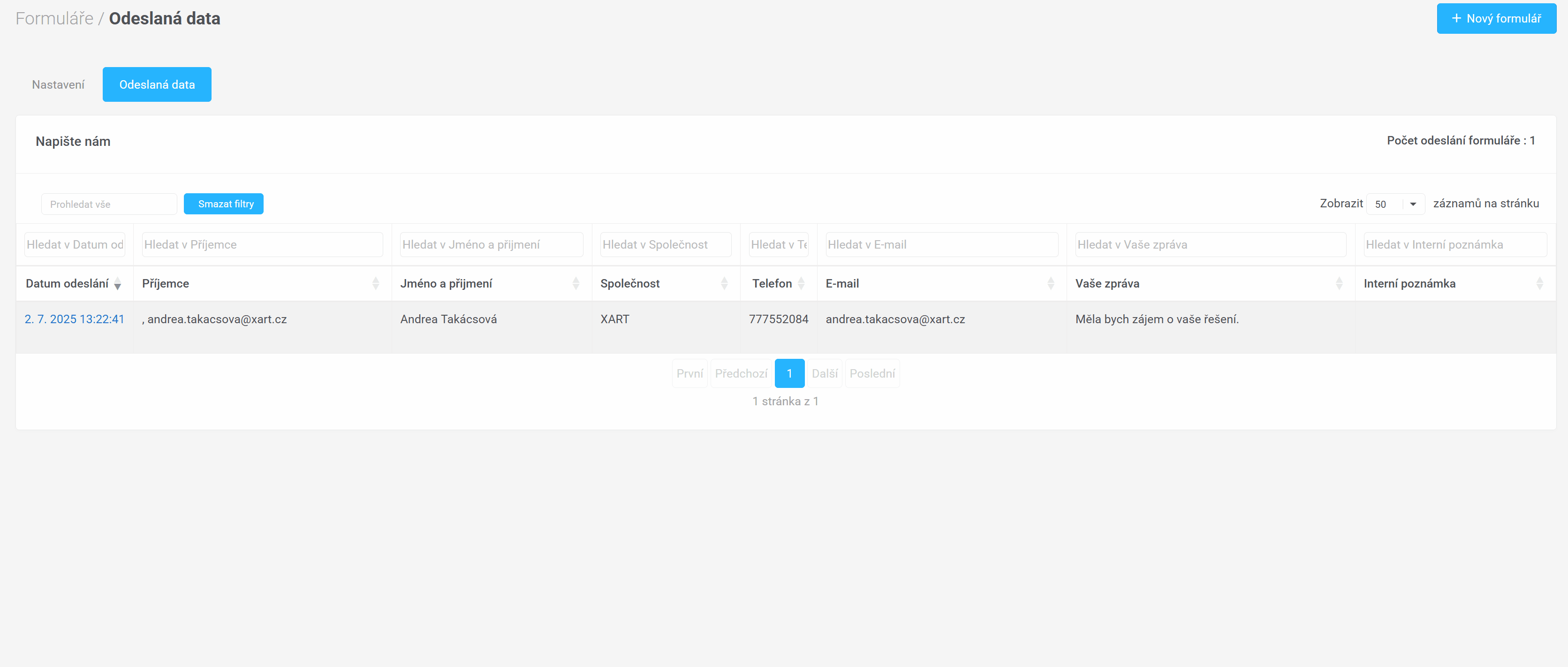 - evidence všech vyplněných a odeslaných dat příslušného formuláře