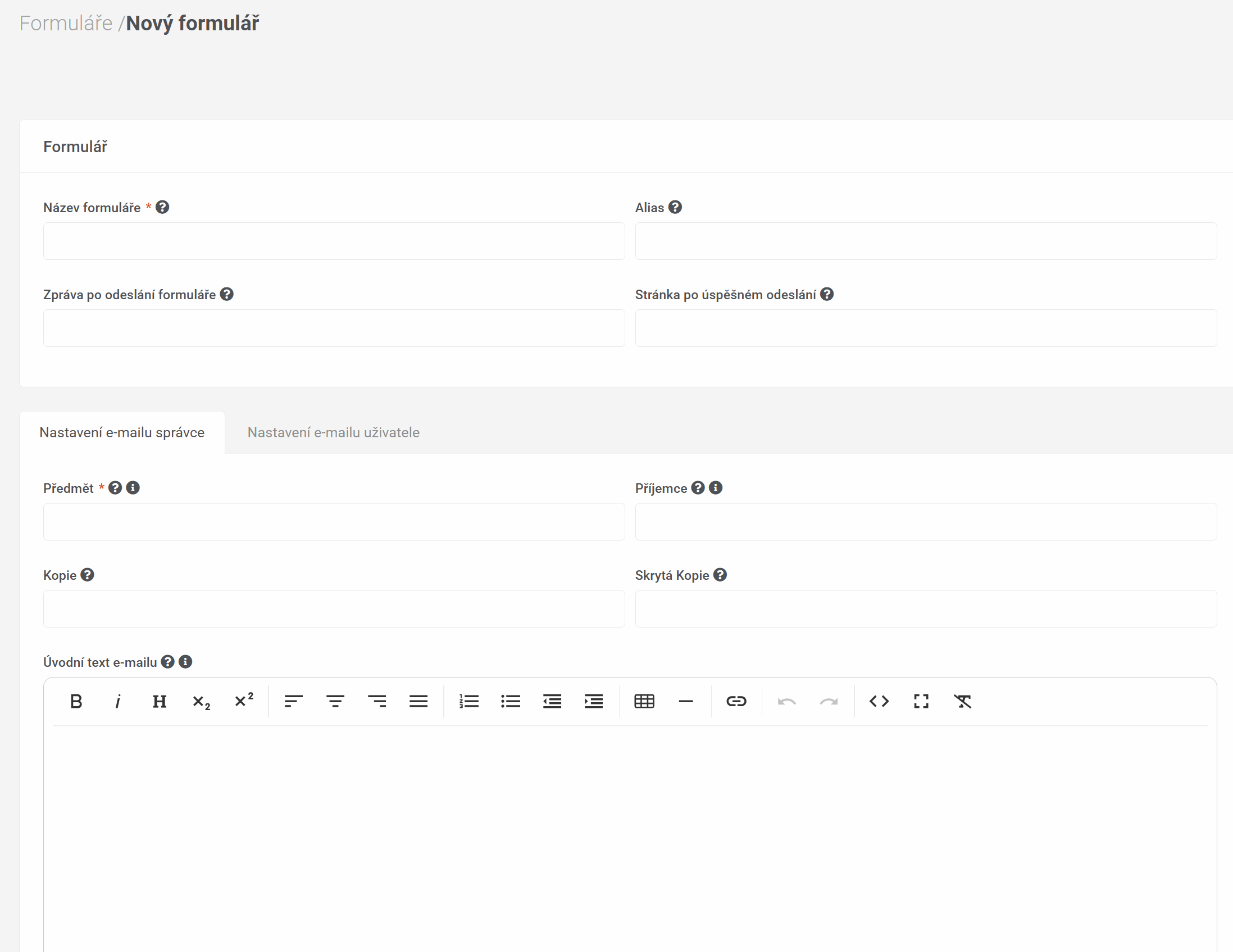 - Nastavení e-mailu správce - zde nastavíte předmět zprávy e-mailu, komu mají vyplněné formuláře chodit a můžete přidat úvodní text emailu, ve výchozí stavu je úvodní text prázdný, v e-mailu bude pouze přehled vyplněných polí