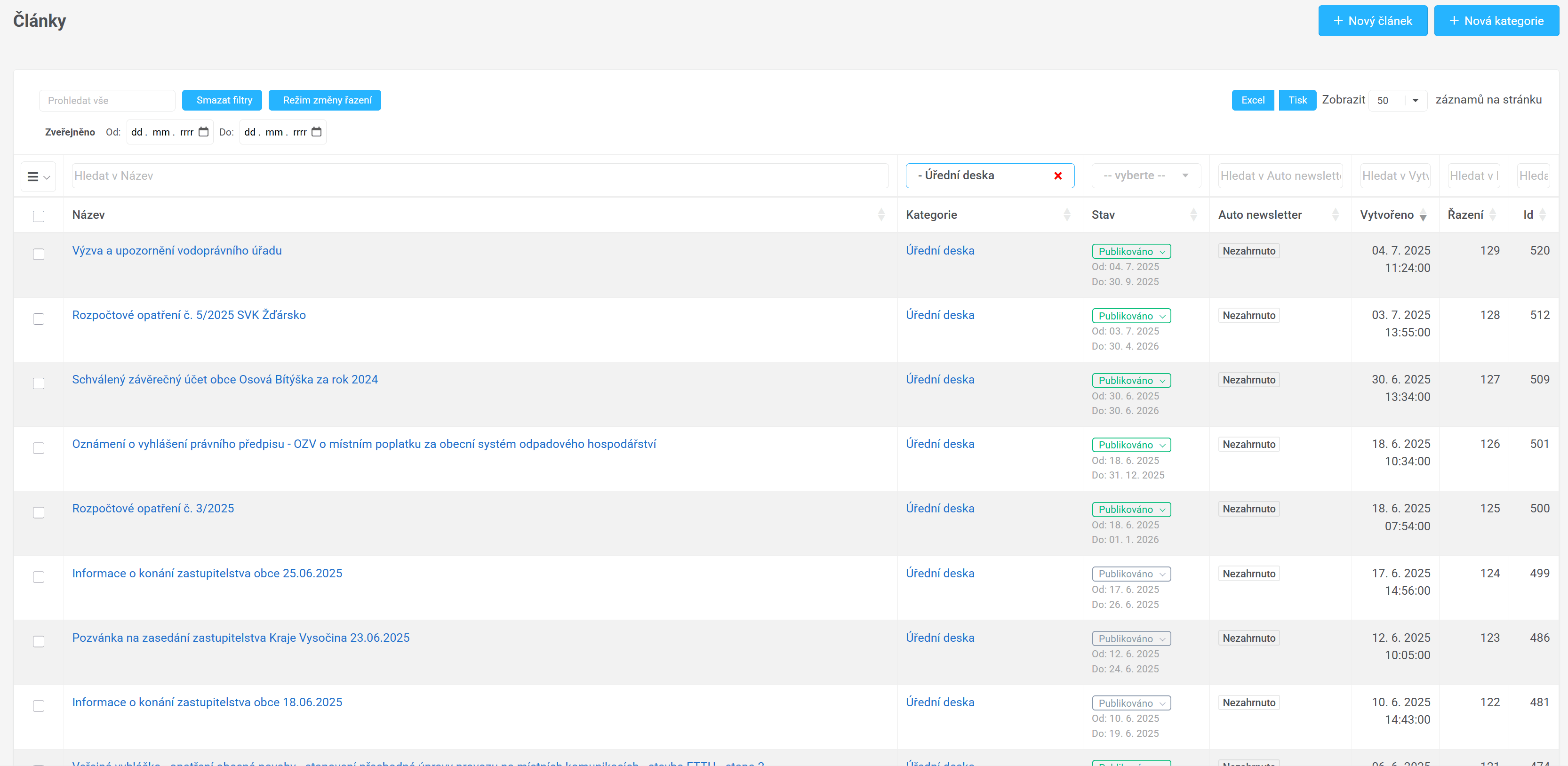 Balíček umožňuje filtrovat dokumenty v kategorii článků Úřední deska dle termínu publikování.