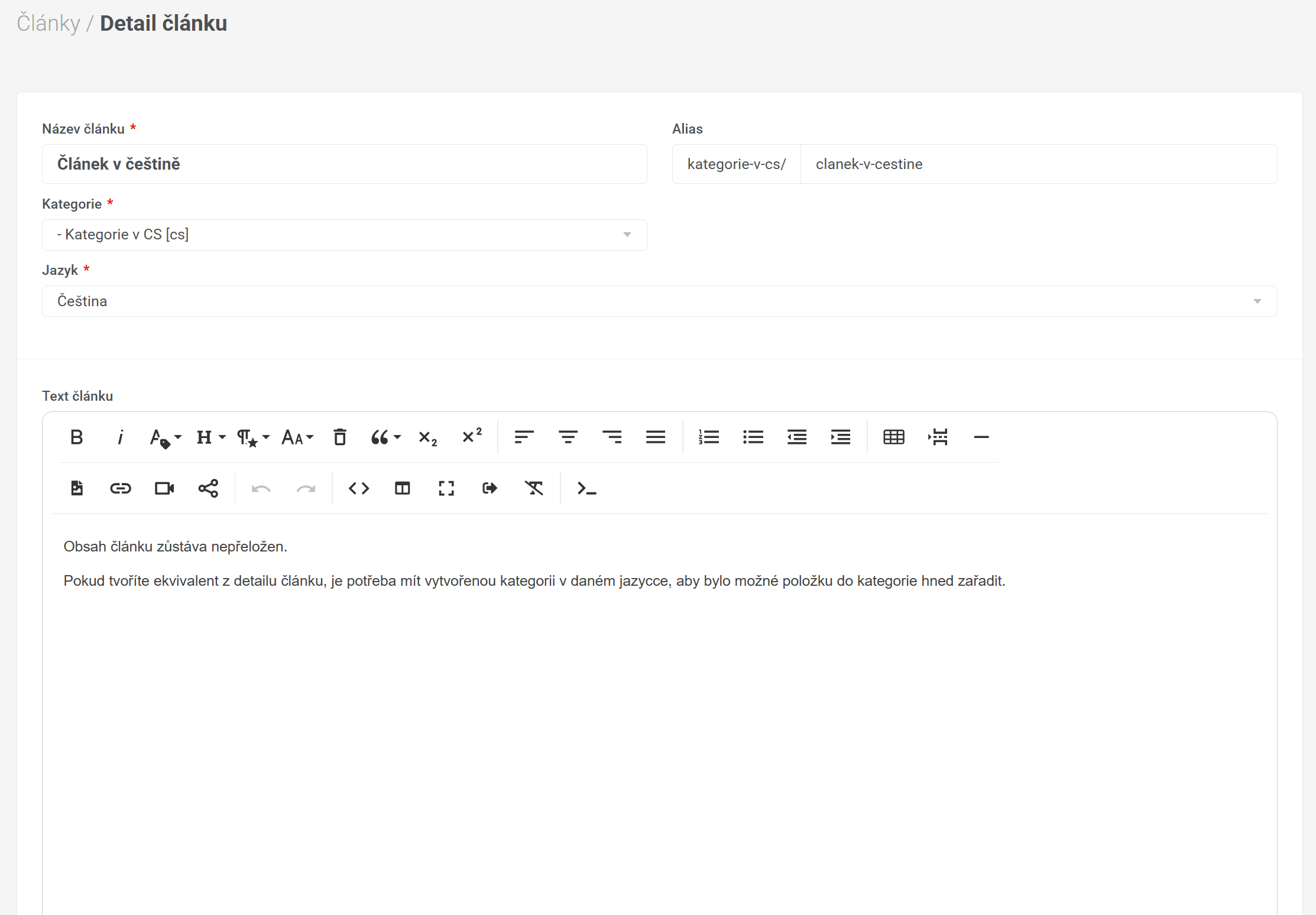 - pokud tvoříte ekvivalent z detailu článku, je potřeba mít vytvořenou kategorii v daném jazyce, aby bylo možné položku do kategorie hned zařadit