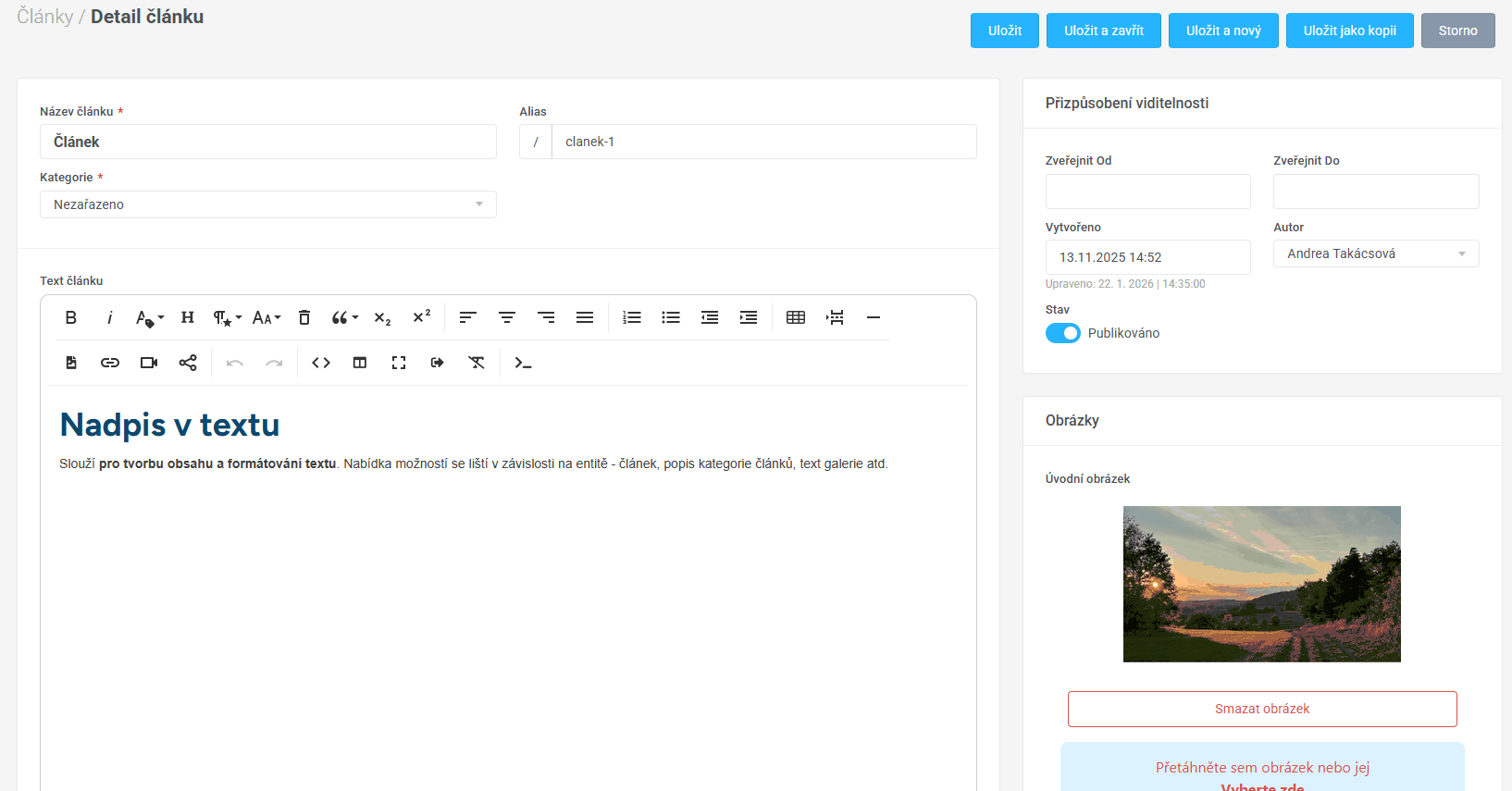 - lze nastavit datum vytvoření článku