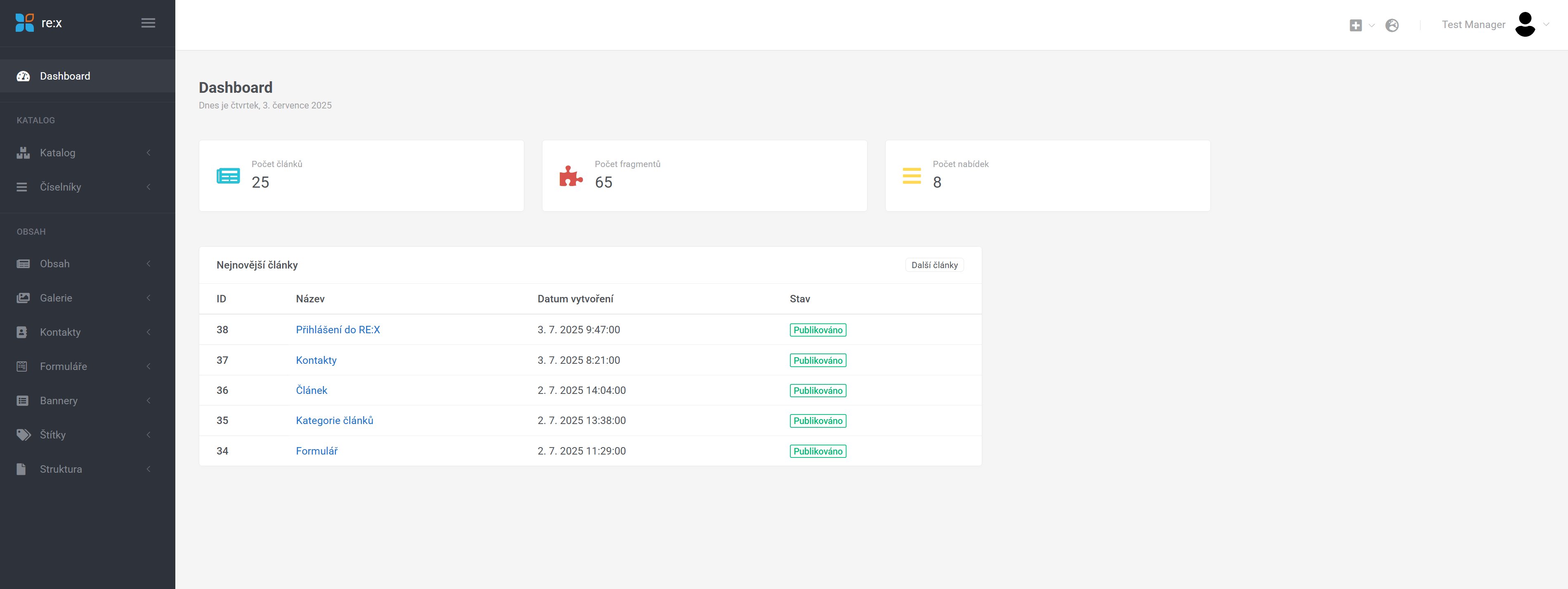 • zobrazované informace na dashobradu se liší dle typu řešení (poslední články, objednávky, odeslané formuláře ...)