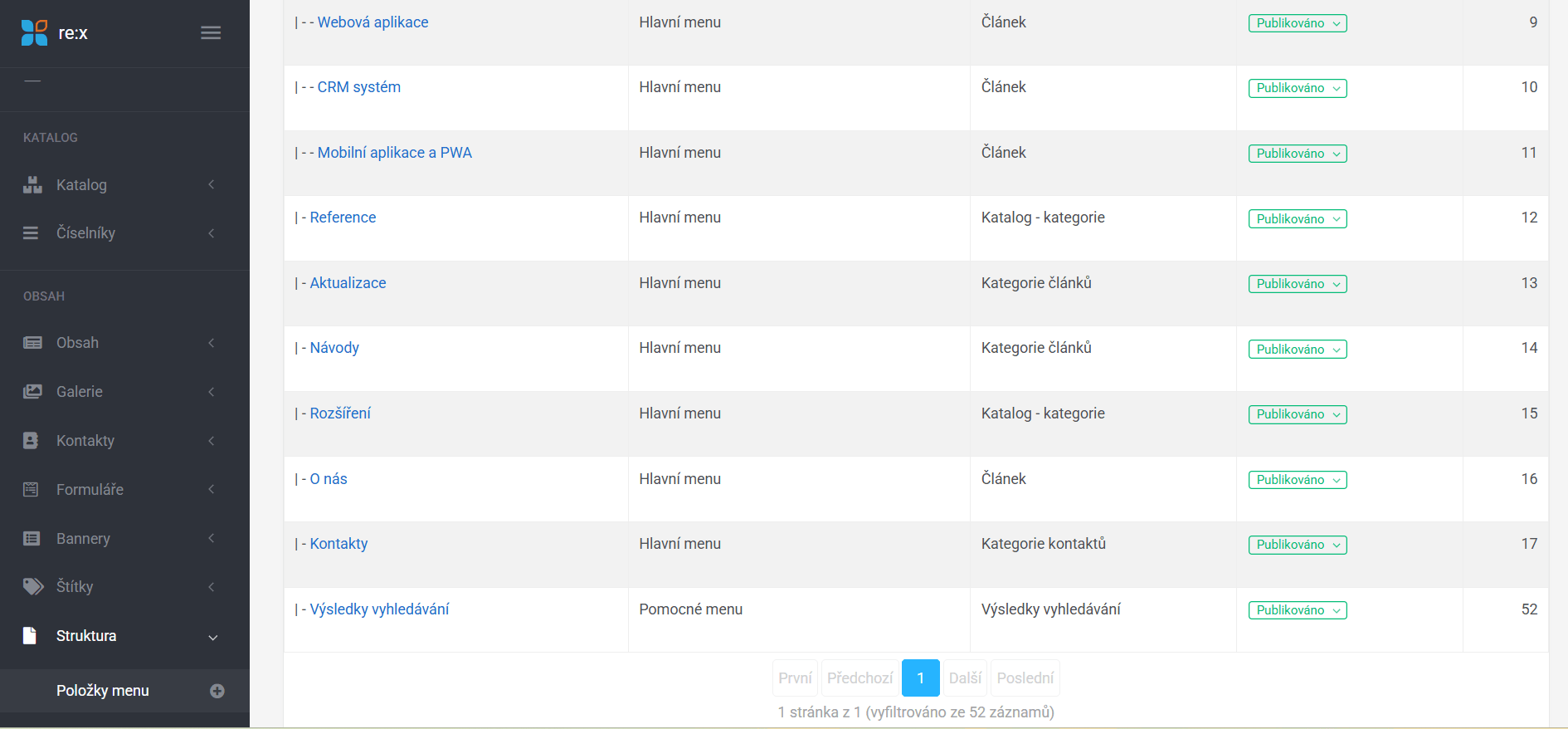 - položky a podpoložky menu definují, co se po kliknutí zobrazí (článek, výpis článků z kategorie, galerie, kontakty, formulář, externí URL)