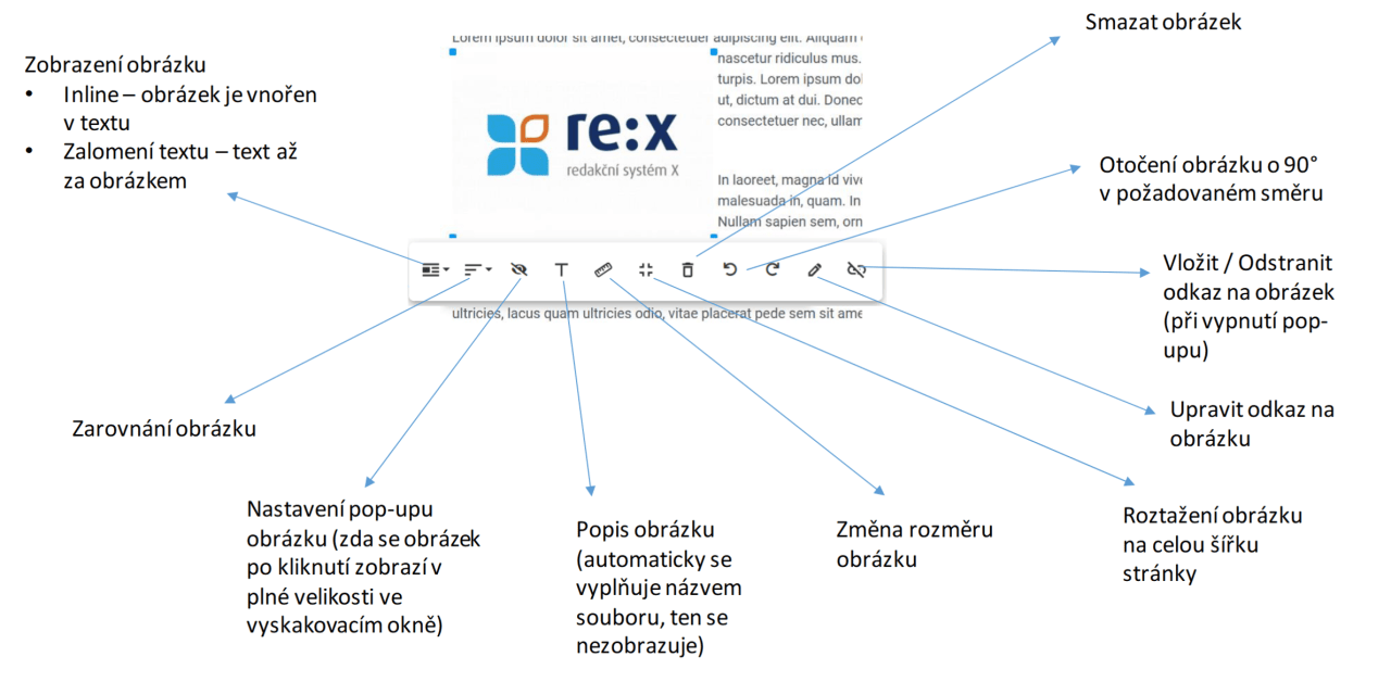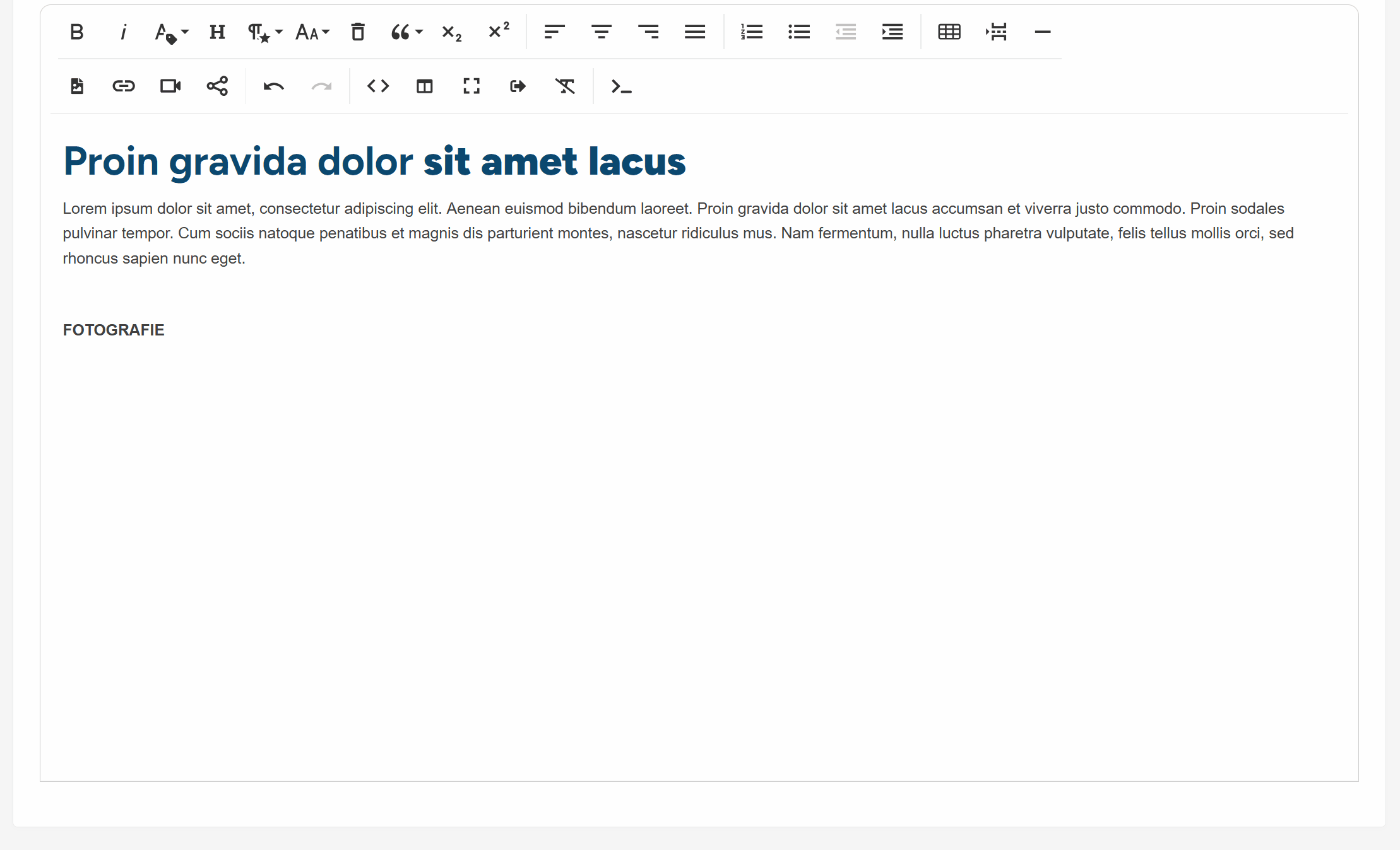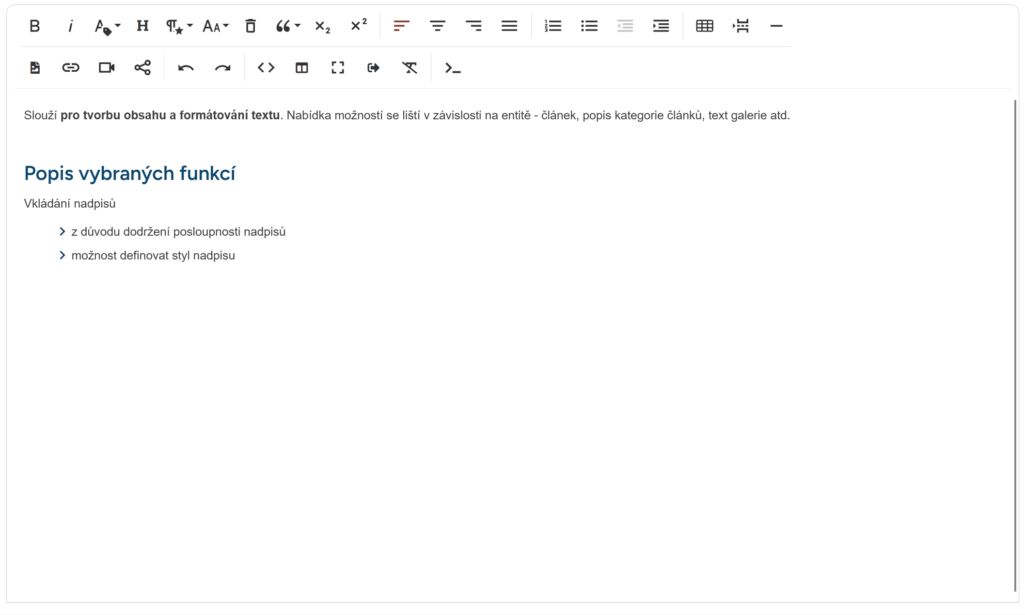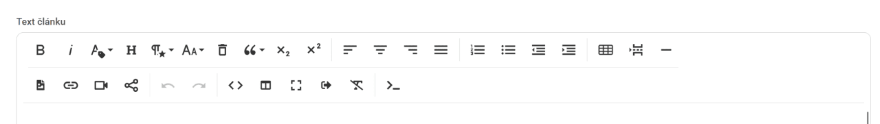 Slouží pro tvorbu obsahu a formátování textu. Nabídka možností se liští v závislosti na entitě - článek, popis kategorie článků, text galerie atd.