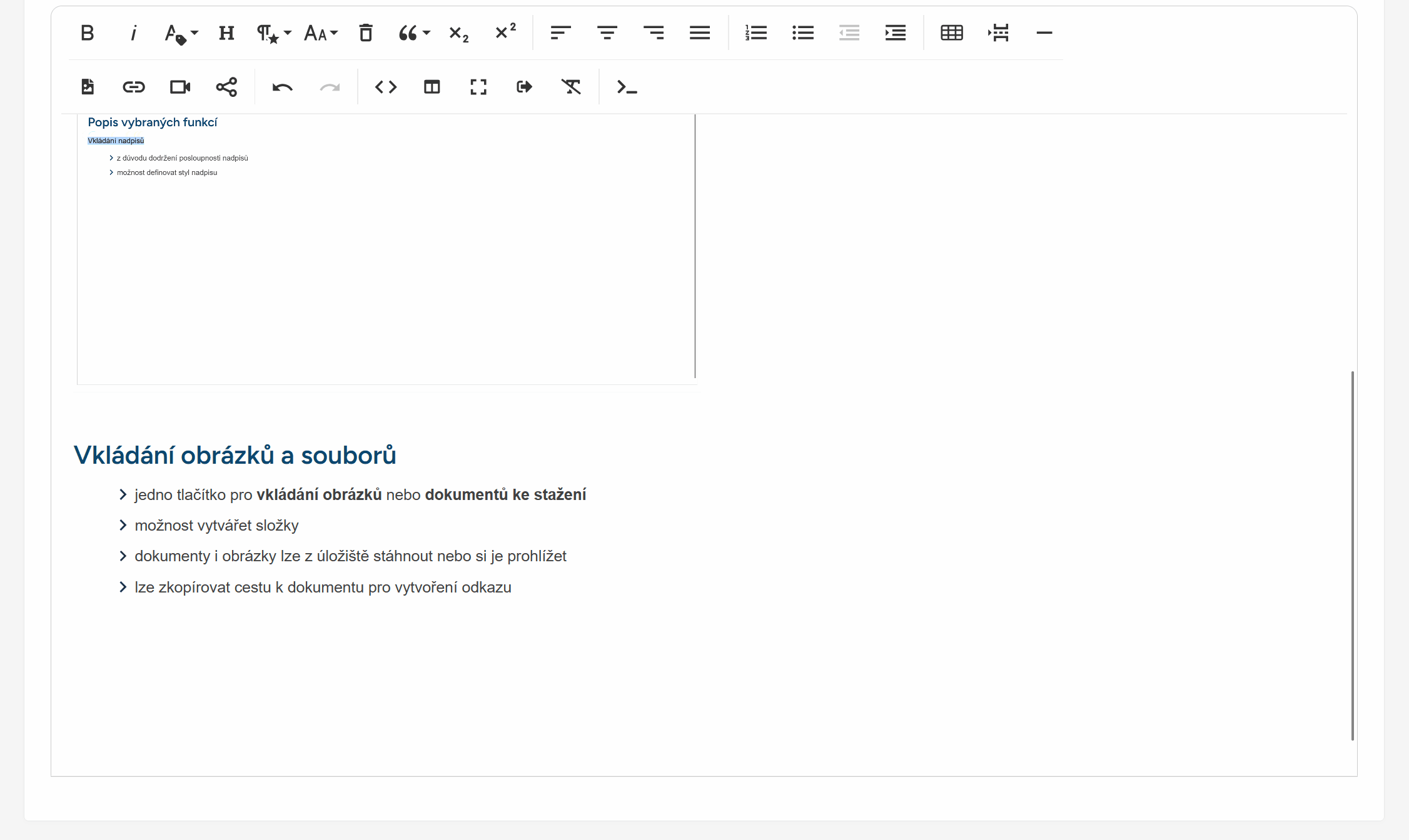 - jedno tlačítko pro vkládání obrázků nebo dokumentů ke stažení